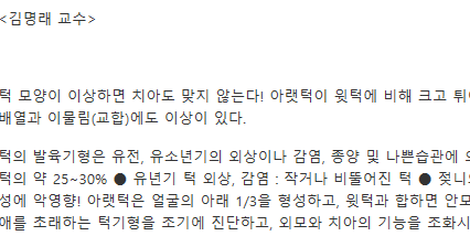 <김명래 교수> 턱 모양이 이상하면 치아도 맞지 않는다! 아랫턱이 윗턱에 비해 크고 튀어나온 "주걱턱", 아랫턱이 윗턱에 비해 작고 뒤에 쳐진 "왜소악", 입을 다물어도 앞니가 물리지 않는 "개교증", 턱이 한쪽으로 쏠려 기울어진 "비대칭악", 웃을 때 이가 튀어 나오고 잇몸이 많이 보이는 "양악전돌증", 이러한 턱의 발육기형은 치아의 배열과 이물림(교합)에도 이상이 있다. 턱의 발육기형은 유전, 유소년기의 외상이나 감염, 종양 및 나쁜습관에 의하여 시작되지만 성장과 함께 두드러겨서 대개 중학교에 들어가면서 알게되고, 이러한 외모의 이상과 기능적 장애는 소년기의 학교생활이나 청년기의 사회생활에 부정적인 영향을 미치는 예가 많다. 턱기형은 왜 생기나! ● 유전성 : 골격성 주걱턱의 약 25∼30% ● 유년기 턱 외상, 감염 : 작거나 비뚤어진 턱 ● 젖니의 교환이상 : 젖니의 조기 탈락 ● 영구치의 조기탈락 : 앞니로 밥먹기 ● 나쁜 습관 : 한쪽으로 밥먹기, 손가락 빨기, 입으로 숨쉬기, 혀내밀기, 턱고이기 ● 치열교정을 하다가 중단했을 때 ● 내분비 이상 : 성장호르몬의 과소, 과다 턱기형, 성격형성에 악영향! 아랫턱은 얼굴의 아래 1/3을 형성하고, 윗턱과 합하면 안모의 2/3을 결정하며, 턱 모양은 그 사람의 인상은 물론 성격까지도 영향을 줄 수 있다. 턱기형은 위, 아래턱의 이가 맞지않아 저작기능이 불완전하고 신체의 발육장애를 동반할 수 있으며, 발음과 조음에도 영향을 미친다. 따라서 외모, 발음, 저작장애를 초래하는 턱기형을 조기에 진단하고, 외모와 치아의 기능을 조화시킬 때 신체발육과 정신심리적 발달에도 크게 도움이 된다. 턱기형, 어떻게 알게되나? ● 음식먹는 모습이 다른 아이와 다르다. ● 음식을 가려먹고, 오래 씹는다. ● 말, 발음이 부정확하다. ● 윗니가 아랫니를 덮지 않는다. ● 학생증이나 증명사진에서 얼굴이 비대칭이다. 턱기형의 진단, 분석, 치료계획 나쁜 습관에 의한 일시적인 기능성 부정교합인지 단순한 치아배열의 이상인지, 교정치료의 한계를 넘는 골격성 이상인지를 구별해야 한다. 두개골 X-선 사진분석과 구강모형분석 등으로 현재의 치아물림과 성장상태, 앞으로의 가능성에 대해 검진 받을 필요가 있다. 본원에서는 최신 컴퓨터 영상 얼굴분석 및 컴퓨터 모의 수술로 정확한 치료계획을 수립하고 수술 후 모습의 변화를 실제 모습으로 예측해볼 수 있다. 교정치료? 턱 수술? ● 조기 발견한 주걱턱이라면: 치열교정 장치로 예방 및 개선할 수 있다. 짧게는 수개월, 길면 2∼3년 동안. ● 골격성 턱 기형은: 치열교정으로 치아의 경사와 위치를 고친 다음, 성장이 완료되는 만 16∼18세 이후에 턱뼈를 절단하여 원하는 위치로 옮기는 턱교정수술이 필요하며, 외모와 기능을 단기간에 개선시킬 수 있다. ● 턱 수술은 입속에서 행하여지므로 겉으로는 상처가 남지 않고, 2주일 후에는 일상생활이 가능하지만, 뼈는 2개월이 되어야 완전히 치유되므로 학생들은 주로 방학을 이용하고 있다. ●수술후 치아의 교정치료는 부정교합의 종류와 정도에 다라 다르지만, 약6∼9개월 정도가 걸린다. 턱기형 교정수술은 얼굴 미용 성형술과 달라! 턱뼈의 교정수술은 턱과 두개골의 해부학적 계측치와 치아의 배열, 위 아랫니의 물림(교합)이 분석된 다음, 개인별 조화와 균형이 반영되어야 한다. 또한 턱뼈의 절단 교정 후, 새롭게 형성된 이의 물림상태에서 음식을 씹는 기능과 턱뼈의 안정을 얻기 위해, 약 6∼12개월간의 수술 전 치열교정이 필요하며 뼈교정 절단성형술 후에도 부가적인 교정치료가 요하는 교정외과적 복합진료 분야이다. 이대목동병원 치과 김명래 교수 (2650 - 5196) 강서양천신문( )