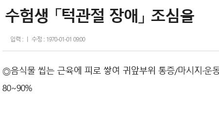 최근 입시준비 마무리에 바쁜 수험생들 가운데 턱관절 부위의 통증으로 입이 다물어지거나 벌어지지 않아 병원을 찾는 사례가 부쩍 많아지고 있다. 이는 오랜 수험준비 과정에서 오는 정신적 긴장과 스트레스로 인해 자신도 모르는 사이에 이빨을 꽉 물거나 턱관절에 무리한 힘을 가하게 되어 음식을 씹는 근육에 피로가 쌓였기 때문이다.음식을 씹는 저작근에 피로가 쌓일 경우 이의 맛물림이 비뚤어지고 턱관절 원판에 염증이 생겨 정상적인 생활이 어렵게 된다. 실제로 서울대 치과병원 구강진단과와 이대 목동병원 구강외과에 따르면 이처럼 턱관절장애를 호소하는 수험생들이 최근들어 매주 15명선에서 많게는 40명까지 몰려들고 있다는 것이다. 턱관절장애의 증세는 입을 벌리고 다물거나 또는 턱을 좌우로 움직일 때 귀앞 부위인 턱관절에서 「달그락」하는 소리가 나는 것으로 시작된다.점차 음식을 씹거나 턱을 움직이기가 어려워지면서 하품을 할 경우 귀앞 부위에 심한 통증이 느껴진다. 또 두통과 현기증,귀울림,목·어깨 통증,코 충혈,지각마비등 여러 증세가 동시에 나타남에 따라 환자들이 곧잘 정형외과,신경외과,내과,이비인후과등을 전전하다가 병세를 키우는 경우가 많다고 전문의들은 진단했다. 이대 목동병원 김명래교수(구강외과)는 『턱관절장애로 치료가 필요한 사람이 전체 국민의 5%선』이라며 『특이하게도 이들 환자중 90% 정도가 여성』이라고 설명했다. 그는 『초기에 병세를 발견해서 자가요법을 실시하면 80∼90%가 수술하지 않고도 완치된다』며 아래·웃니 사이에 손가락 3개를 옆으로 해서 집어 넣었을때 들어가지 않거나,나무젓가락을 씹을때 통증이 있으면 곧바로 전문의를 찾도록 당부했다. 김교수는 이어 『턱관절장애 환자는 딱딱한 음식대신 유동식을 들고 아침·저녁으로 턱관절 부위를 온습포로 맛사지해 주면 효과적』이라면서 『그러나 습관성 안정제및 진통제 복용은 치료를 더 어렵게 하므로 삼가야 한다』고 덧붙였다. 서울대 치과병원 정성창교수(구강진단과)는 턱관절장애의 치료는 꾸준한 운동요법과 행동교정,그리고 스트레스 관리에 달려있다고 말했다. 정교수에 따르면 턱관절을 편안히 하고 목과 어깨근육을 이완시켜주는 가장 대표적인 운동요법은 목운동과 턱관절 회전운동.<박건승기자> [출처: 서울신문에서 제공하는 기사입니다.] http://www.seoul.co.kr/news/newsView.php?id=19941214018001#csidxc0446496891006fab3ae3e60615827a