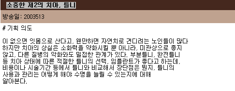 # 출연인사 * 이근우교수 (연세대학교 치대 보철과) 02-361-8720 * 김명래교수 (이화여자대학교 의대 치과) 02-2650-5196 # 촬영협조 * 양천노인종합복지관 02-2649-4848 * 이대목동병원 02-2650-5069 * 연세대학교 치과대학병원 02-361-8720 # 방송내용 1. 틀니, 어떤 사람들에게 필요하나? -우리나라 노인분들, 틀니 얼마나 하고 있나? -틀니 어떤 경우에 필요할까? -젊은데도 틀니를 해야 하는 경우는?